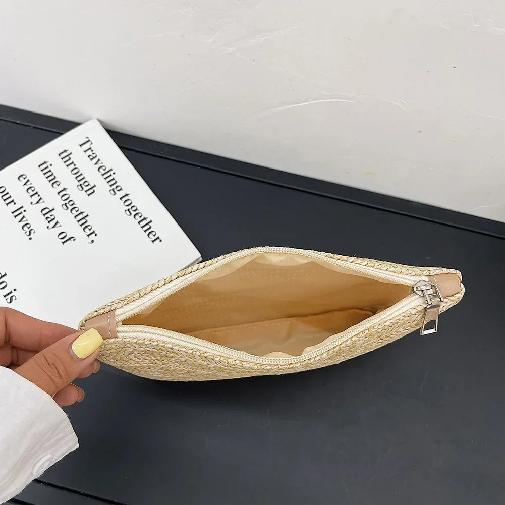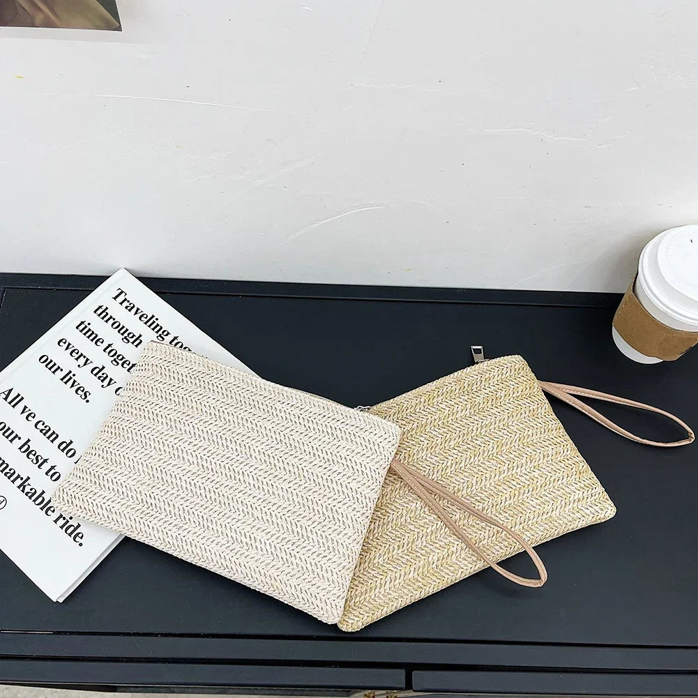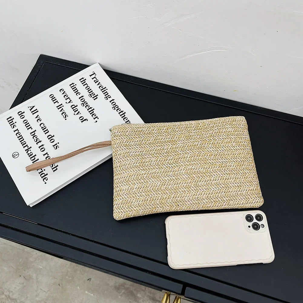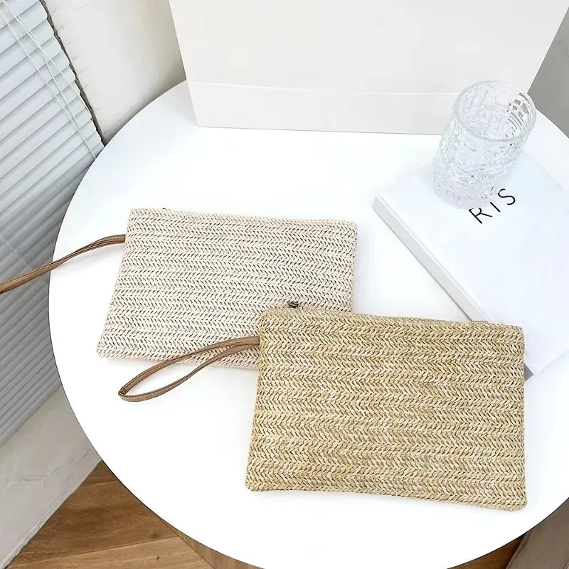 Fashion Women Bohemian Woven Clutch Wristlet Bag Casual Ladies Beach Summer Solid Color Small Handbags Purse