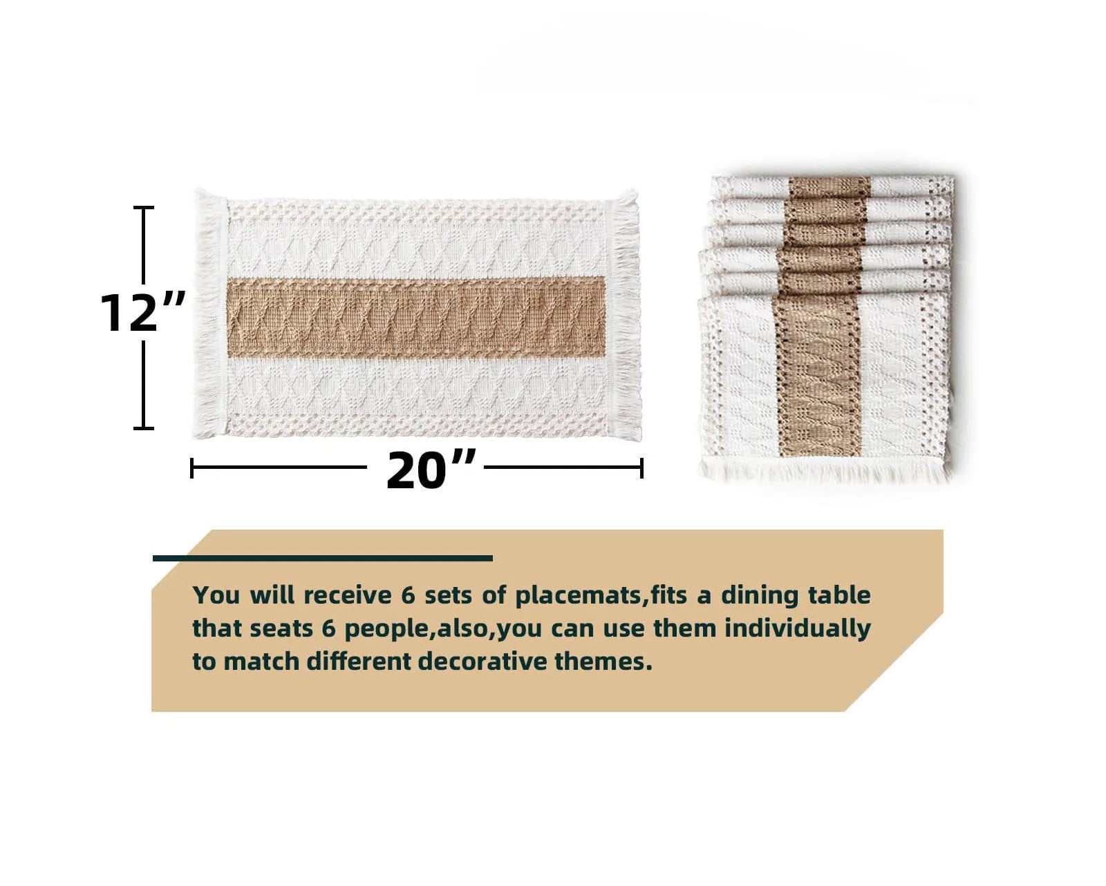 Boho Placemats Set of 6, Macrame Table Decor, Farmhouse Style Placemats, Natural Cotton Burlap, for Dining Table, Kitchen