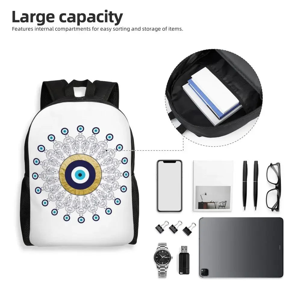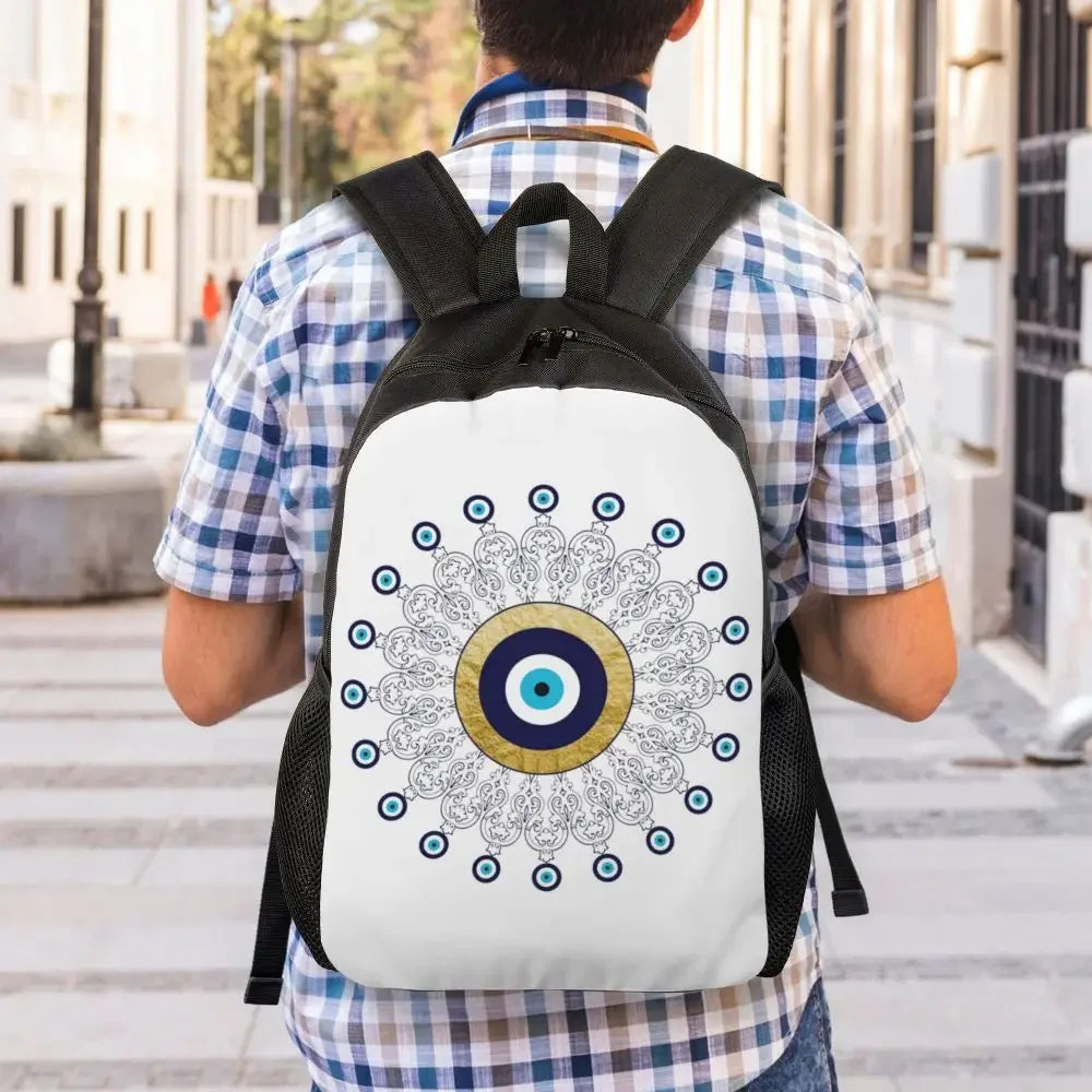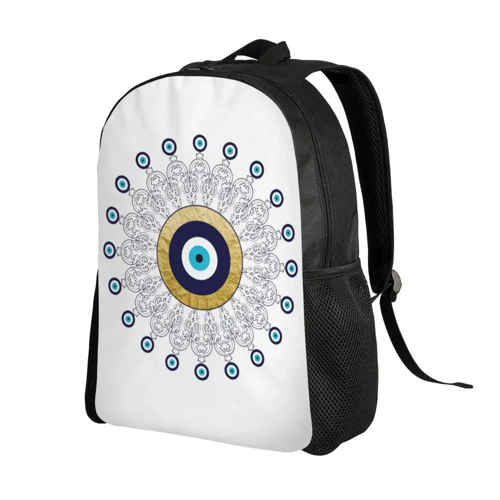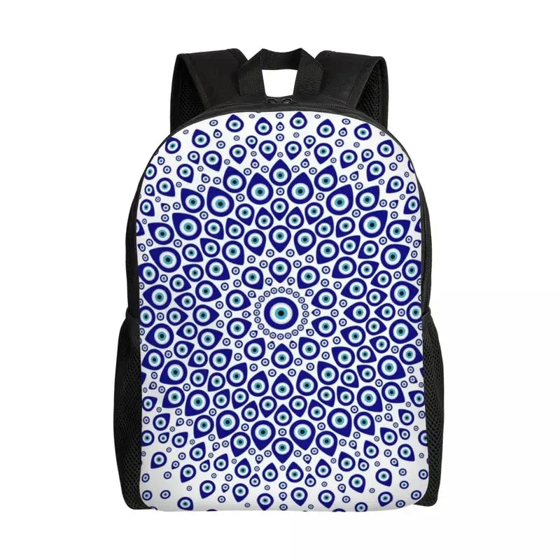 Custom Navy Blue White Mediterranean Evil Eye Mandala Pattern Backpacks Men Casual Bookbag for School College Bohemian Boho Bags