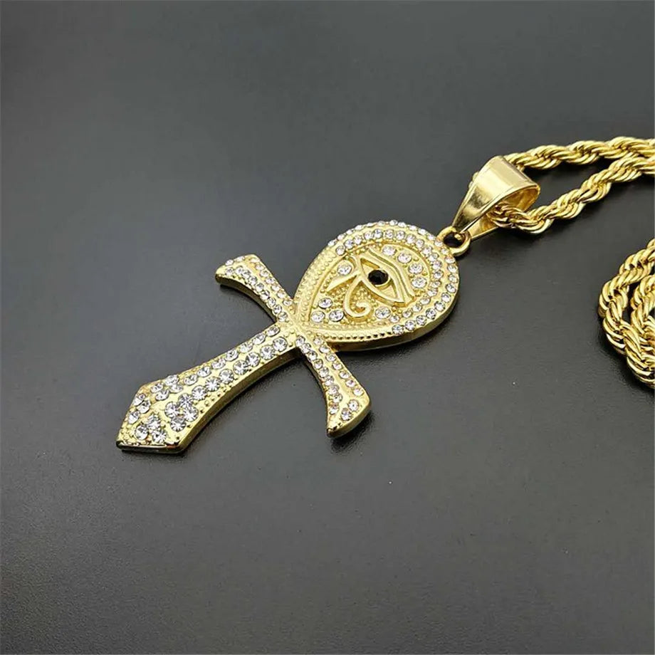 Egyptian Ankh Cross Pendant Necklace For Women/Men Gold Color Stainless Steel Eye of Horus Necklace Iced Out Bling Egypt Jewelry