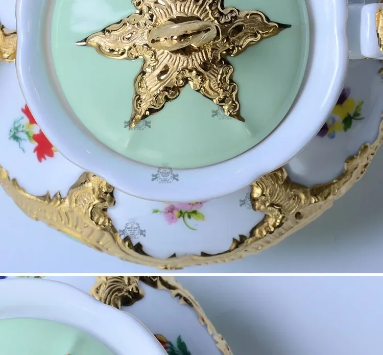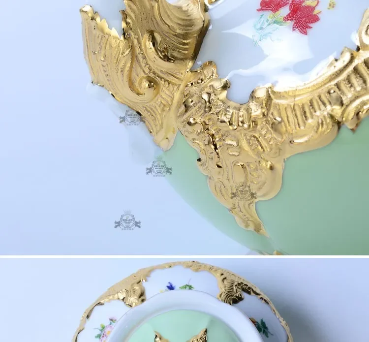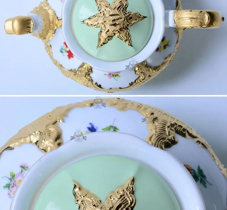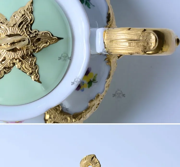 "Baby description": ceramic crafts, Mei Sen B-Form series cream green relief gold-painted high-temperature hard porcelain tea set and coffee set, European royal household items, high-quality high-temperature hard porcelain, and exquisite and extraordinary gold lacquer patterns on the exterior. Atmosphere, nobility, show the master's elegant taste!
