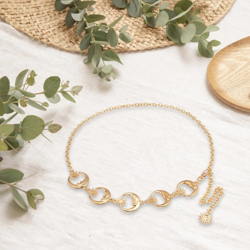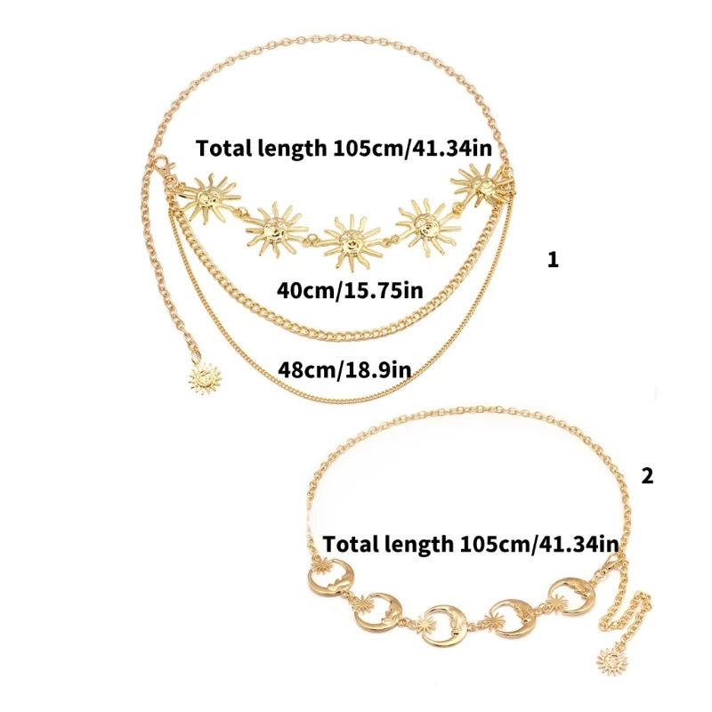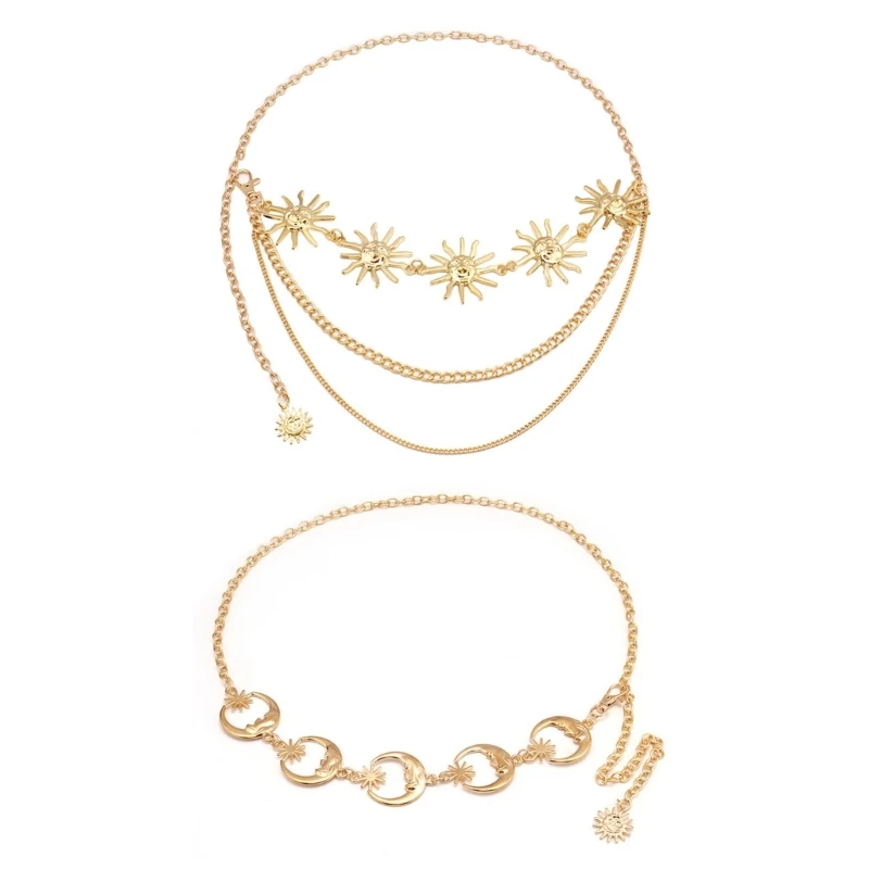 Gold Tone Body Chain Sun/Moon Waist Chain for Stylish Ladies Adjustable Length Metal Waistband for Music Festivals