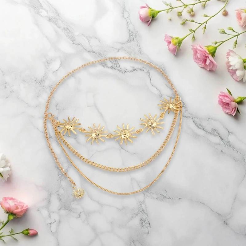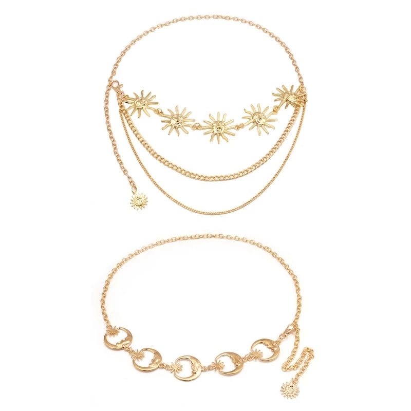 Unleash your inner divas with this body chain, featuring a golden sun/moon designs that makes a statement of