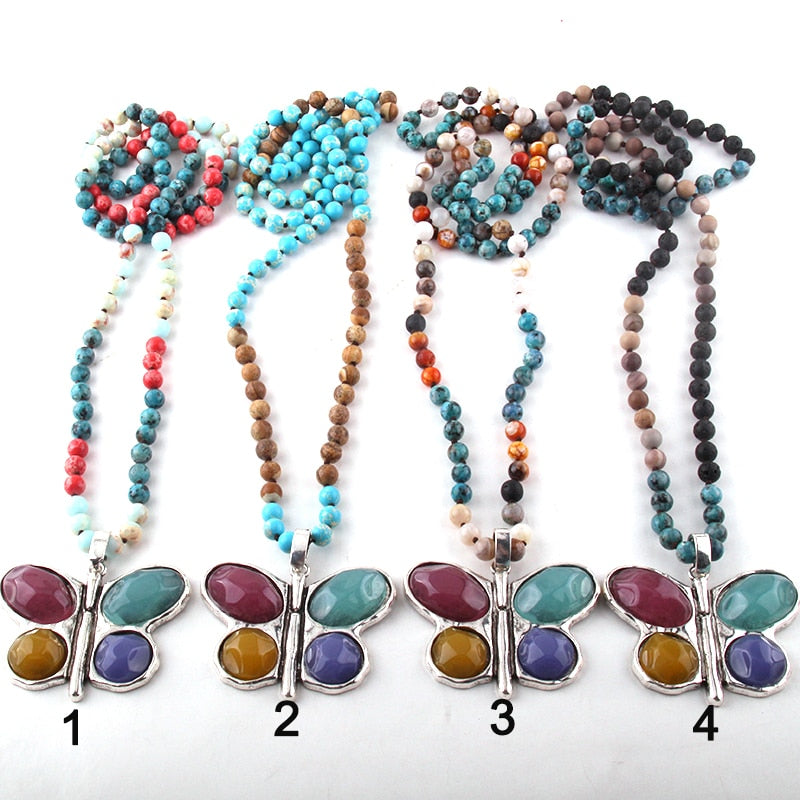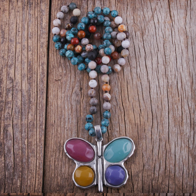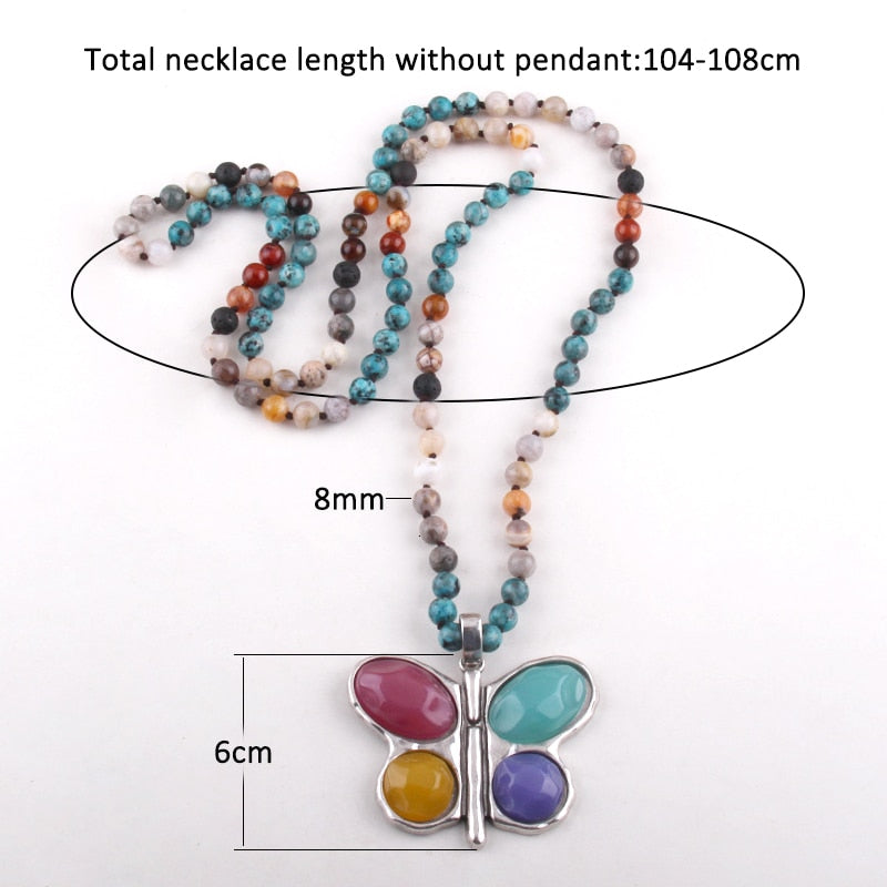New ! 108 Beads Mala Multi Stone Knotted Butterfly Charm Pendant Necklace Women Meditation Yoga Necklace