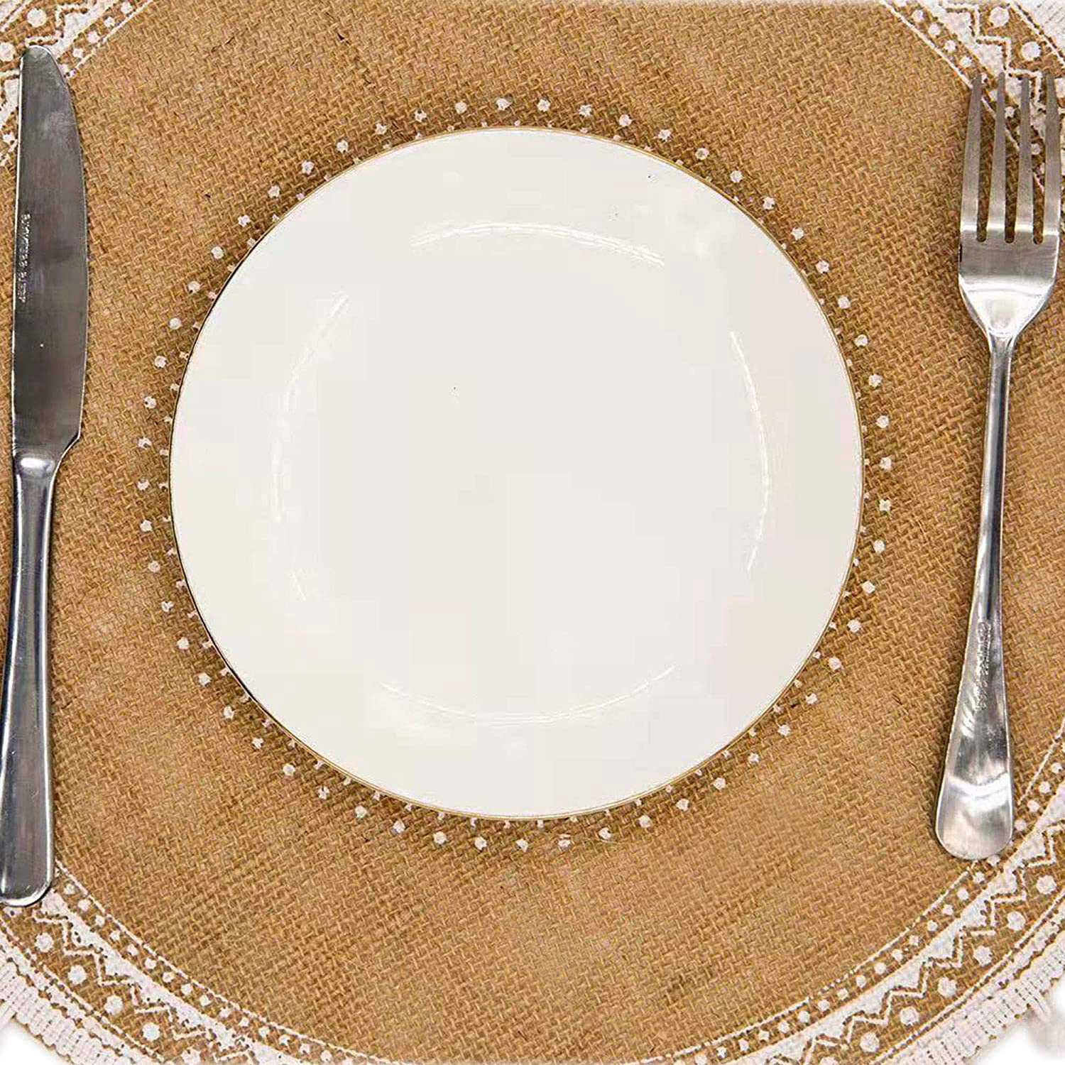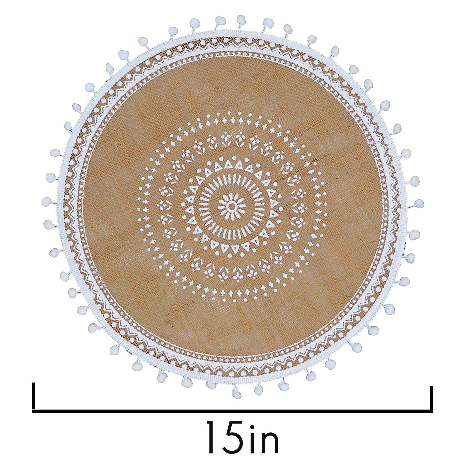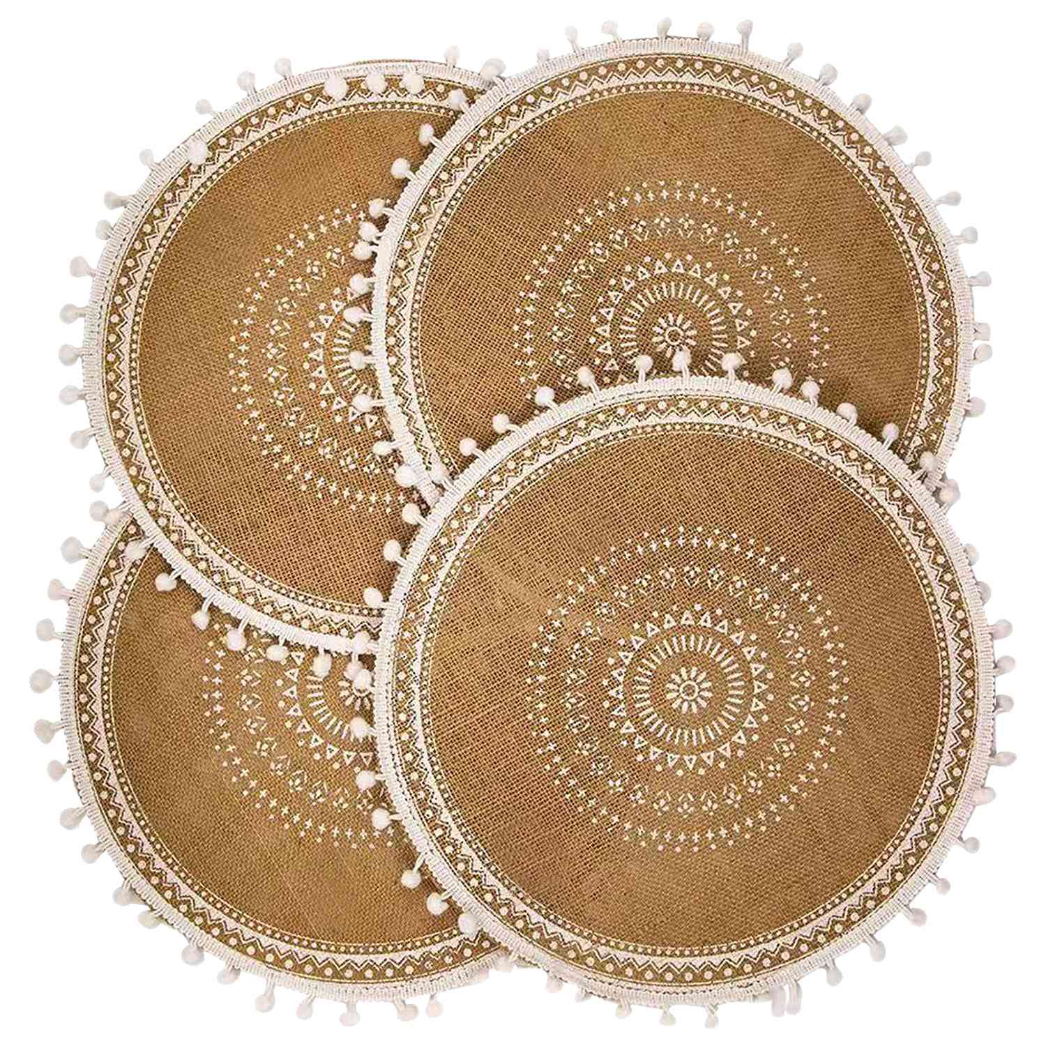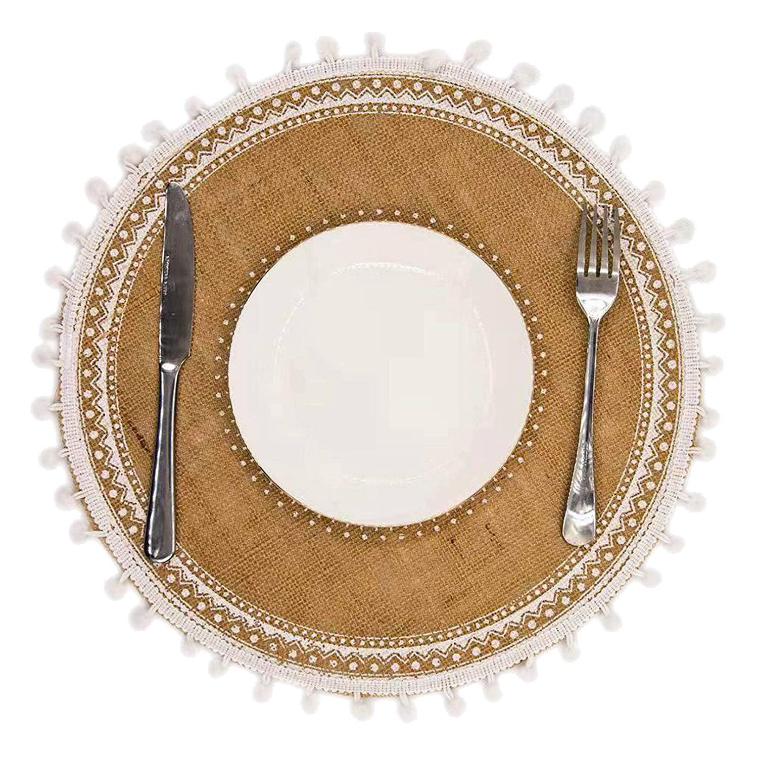 4 Piece Sets Place Mates: Use jute handmade woven table mats, Measures at 15 inch across, Set of 4 dining placemats in per package. Durable round table placemats will allow for long-lasting use. Mandala and Pom Pom Ball Design: Classical black mandala style, white pom pom ball fringe tassel around table placemats, super fashion and modern on this coffee placemat. Mandala lines looks more romantic, update your dining table and kitchen decor. Easy to Clean: wipe clean with a sponge or cloth for daily maintance, if there's a stain on it,just clean it with soft fur brush.You can roll up to store away, placmats can be flatened when put out to use, will not fade and shrink.Not washable. Applicable Scene: Perfect for daily use, good match kitchen,dining room, hotel, business office or farmhouse dinning table. Great for Thanksgiving and Christmas dinner, outside parties and casual kitchen decor. Perfect Protection: Woven placemats decorate your dining table and kitchen, to add more fun to your kitchen table. Protecting your table with these durable place mats. Colour:Brown+white Material:Cotton and linen Size:about 38cm in diameter Package Contents: 4 x placemats Only the above package content, other products are not included. Note: Light shooting and different displays may cause the color of the item in the picture a little different from the real thing. The measurement allowed error is +/- 1-3cm.
