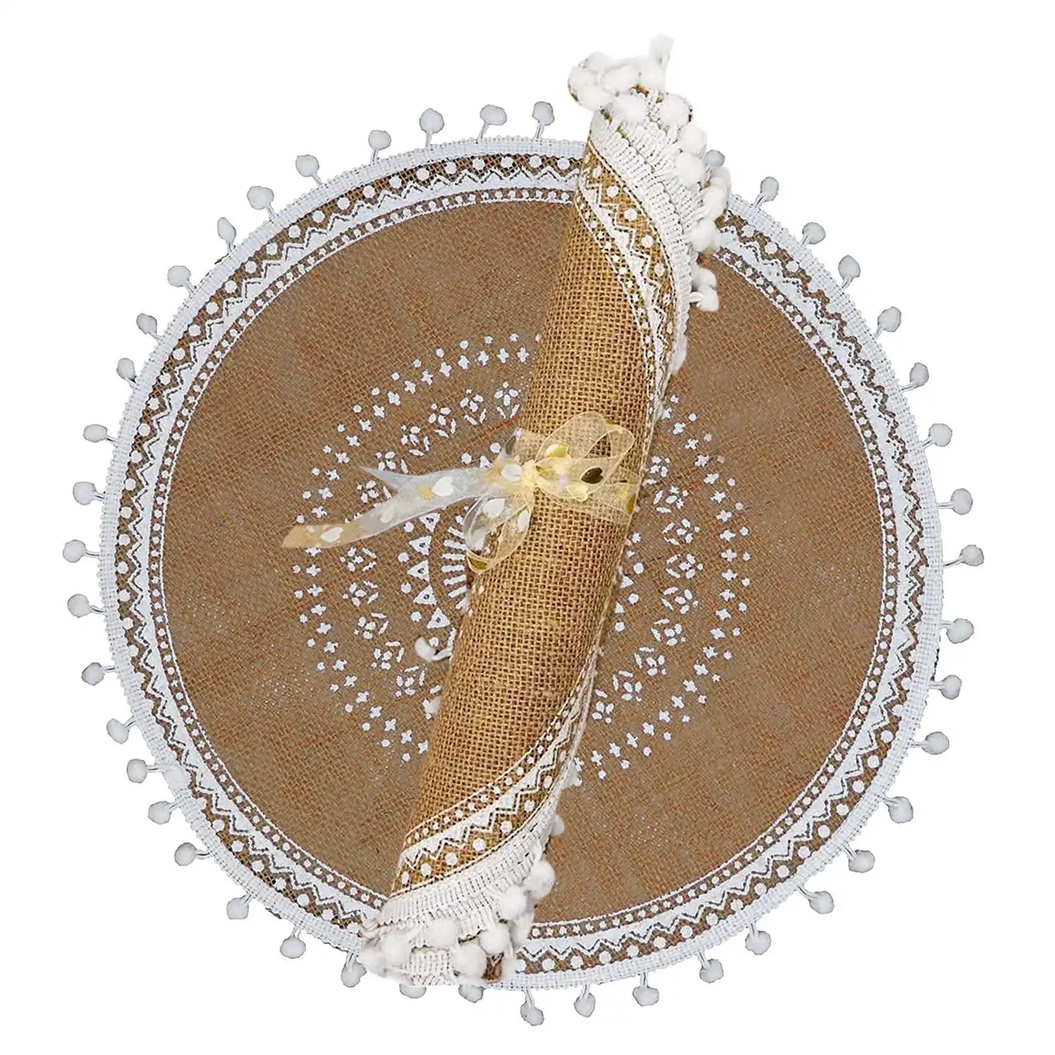 Round Placemats Set of 4 Boho Woven Jute Table Mats with Pompom Tassel for Dining Room Kitchen Table Decor(White Ball)