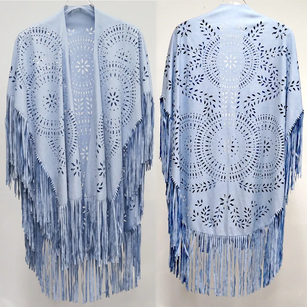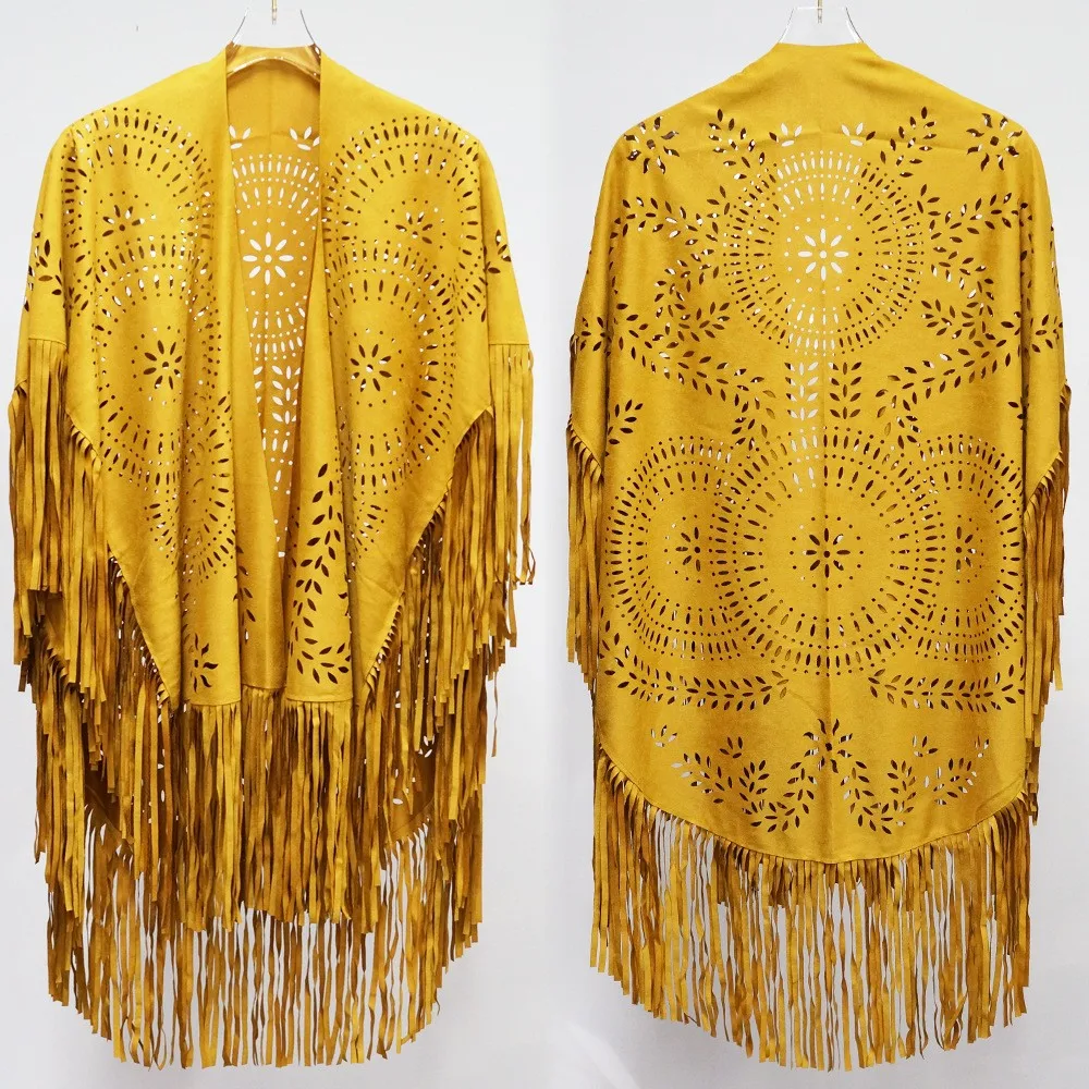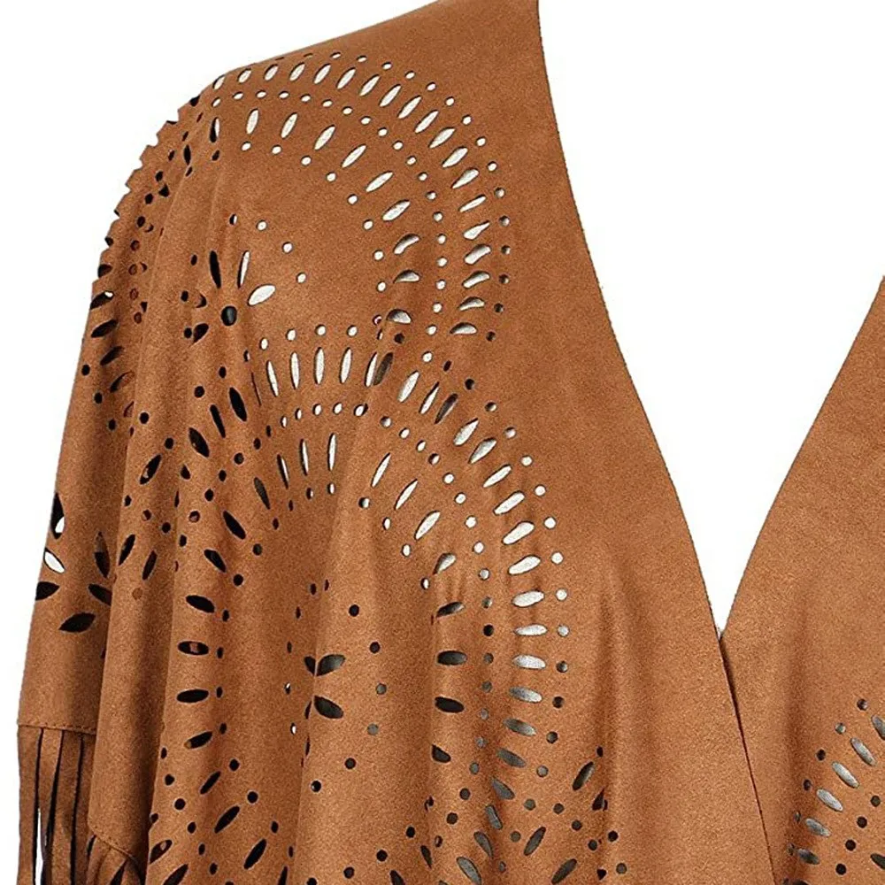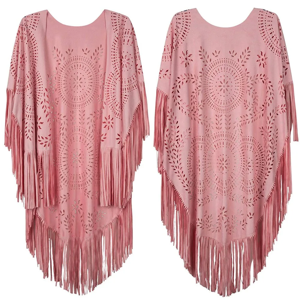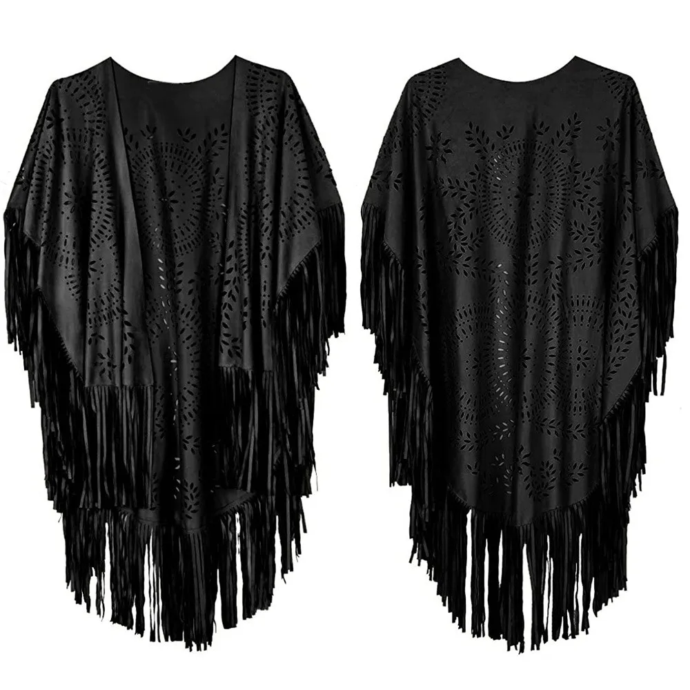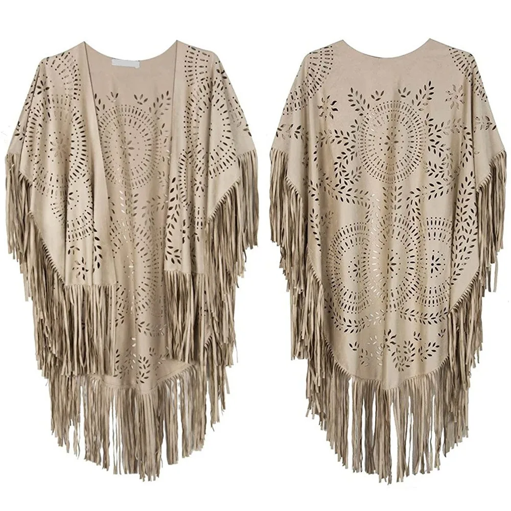 Suede Floral Hollow Out Fringe Tassel Shawl Women Vintage Capes Ponchos Bohemian Cardigan Coat Cloak Boho Capes Bikini Cover