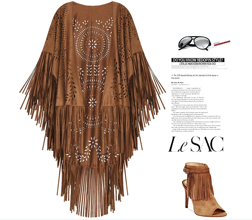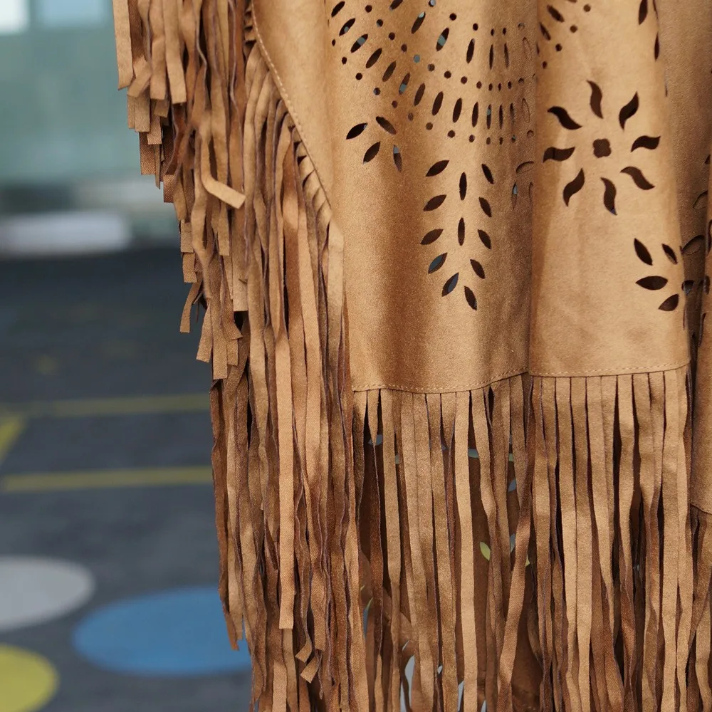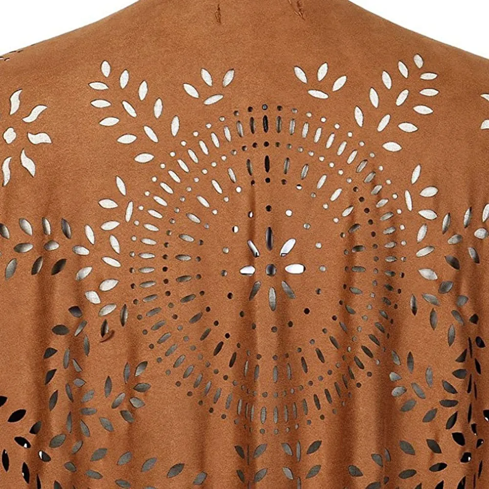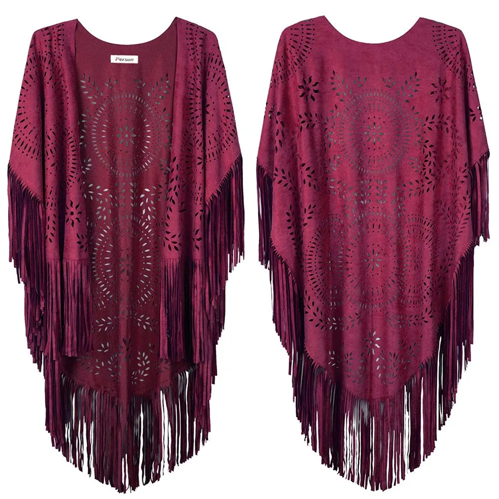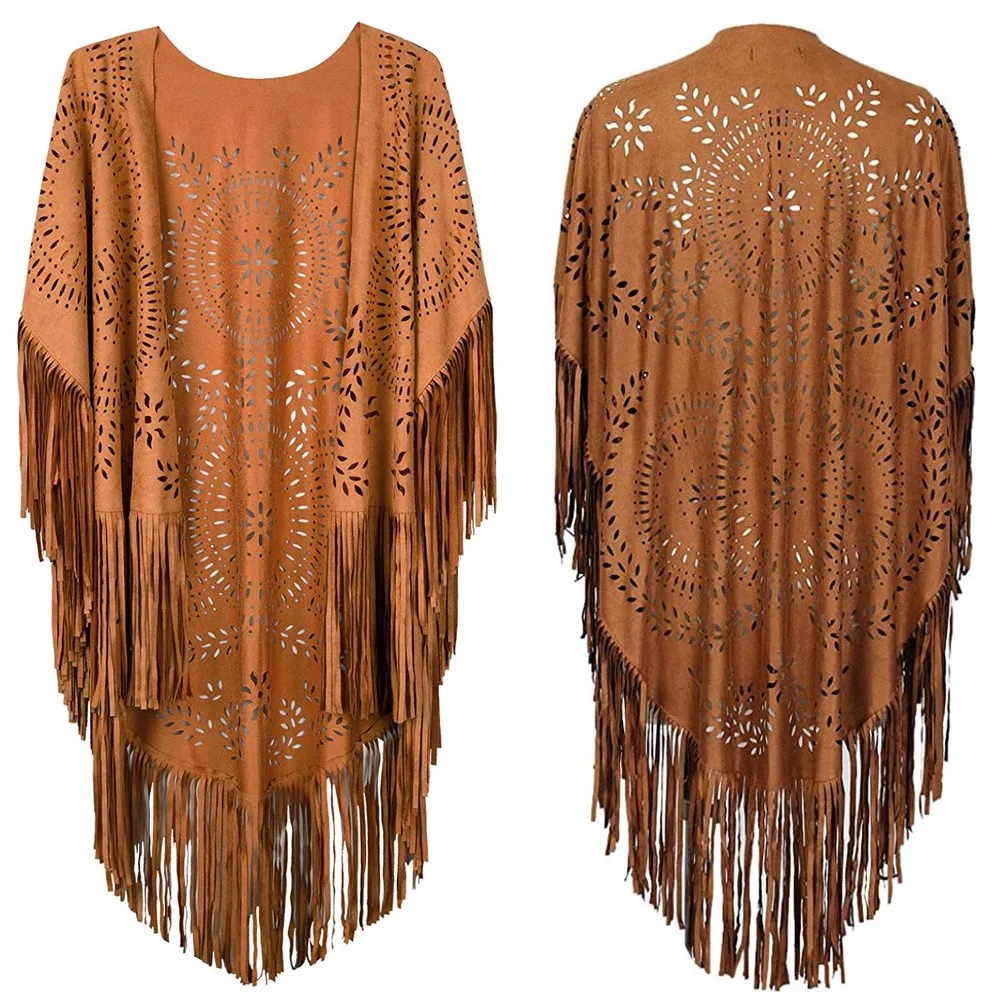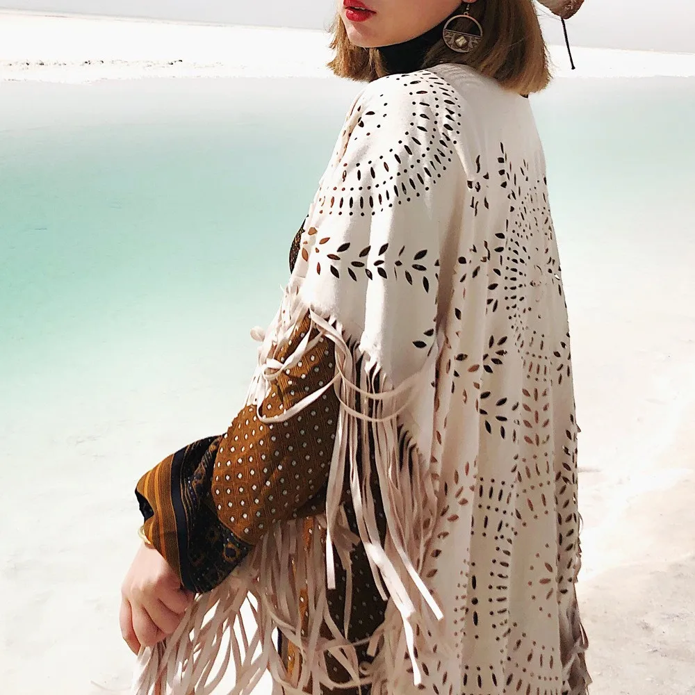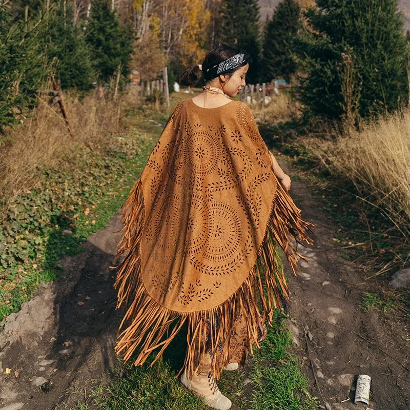 Suede Floral Hollow Out Fringe Tassel Shawl Women Vintage Capes Ponchos Bohemian Cardigan Coat Cloak Boho Capes Bikini Cover
