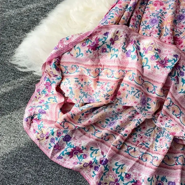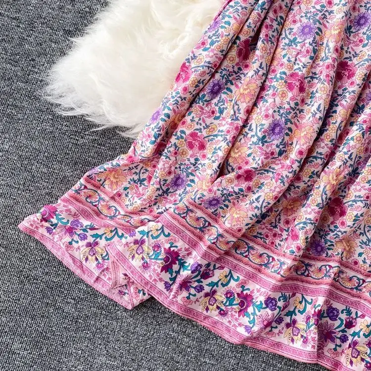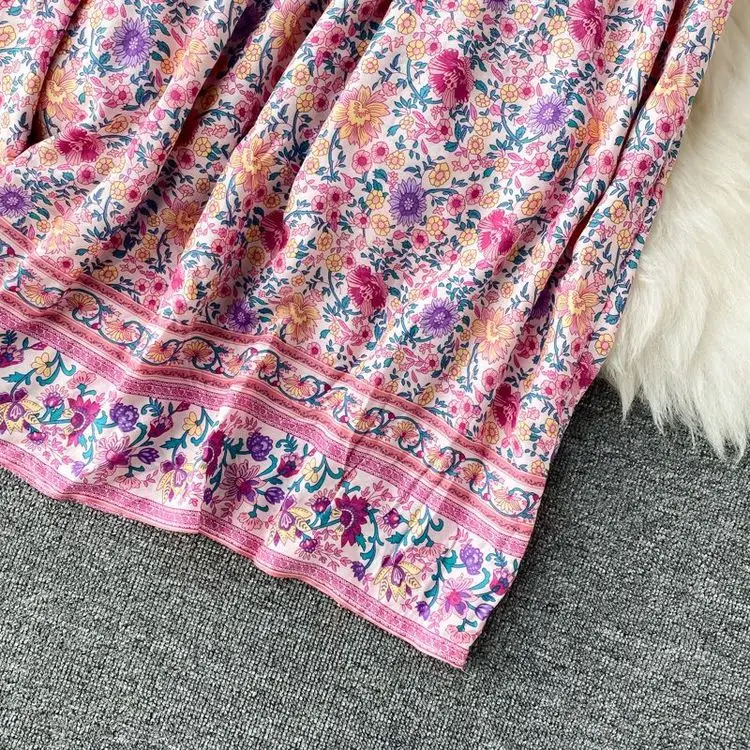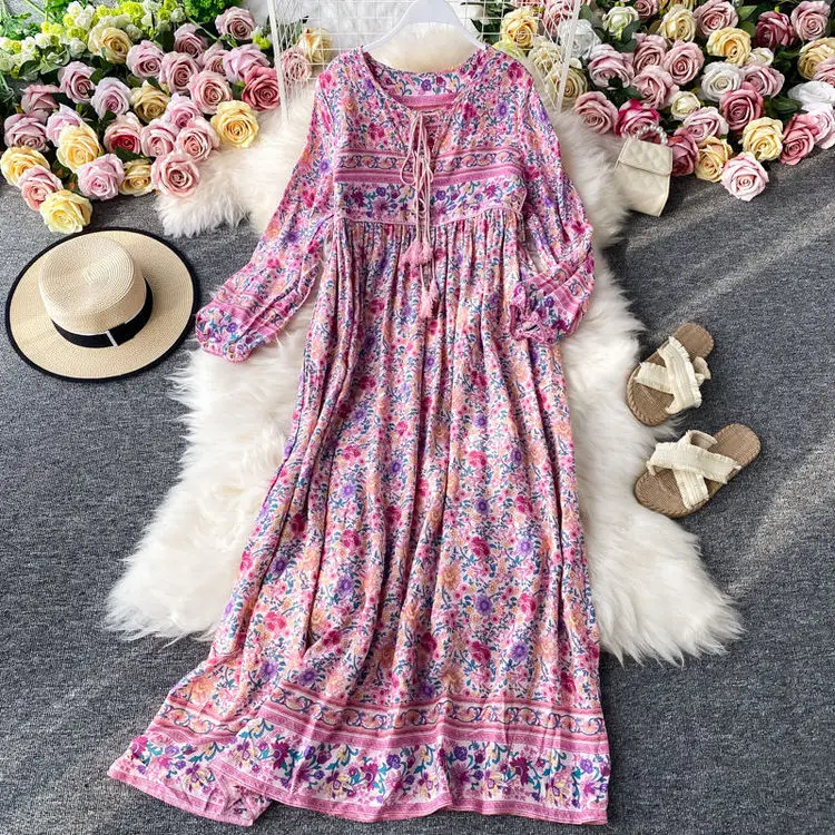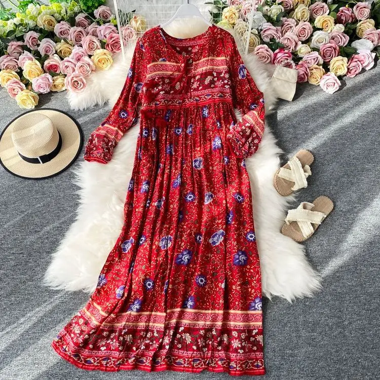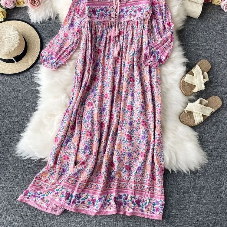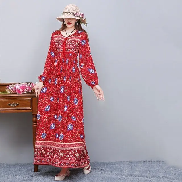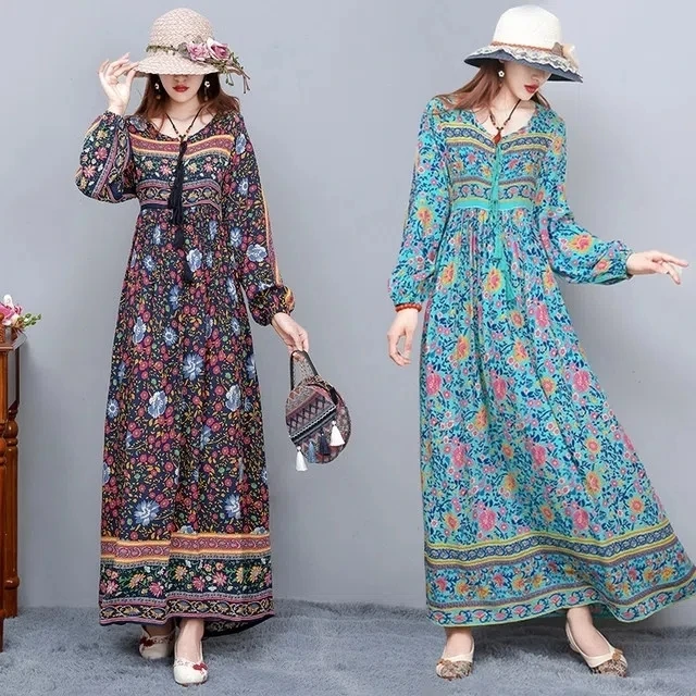 Vintage Women's Beach Skirt Dress Long Sleeve Floral Print Beach Bohemian Straight V-neck Maxi Dress Summer Ladies Dress