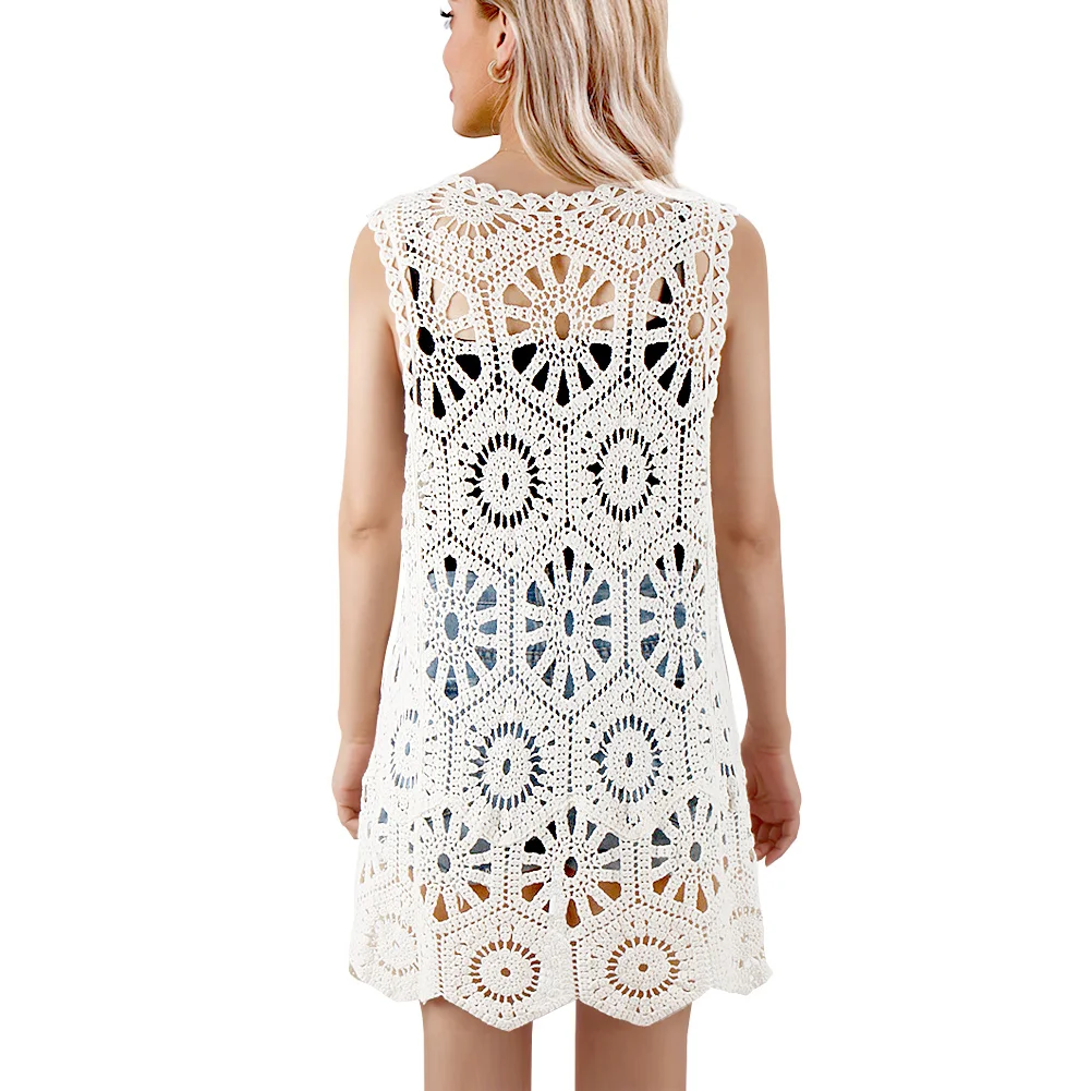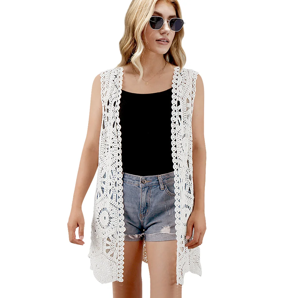 Womens Floral Crochet Lace Boho Trim Sleeveless Open Front Vest Cardigan White Beige